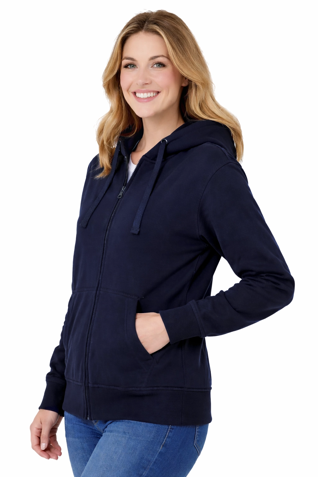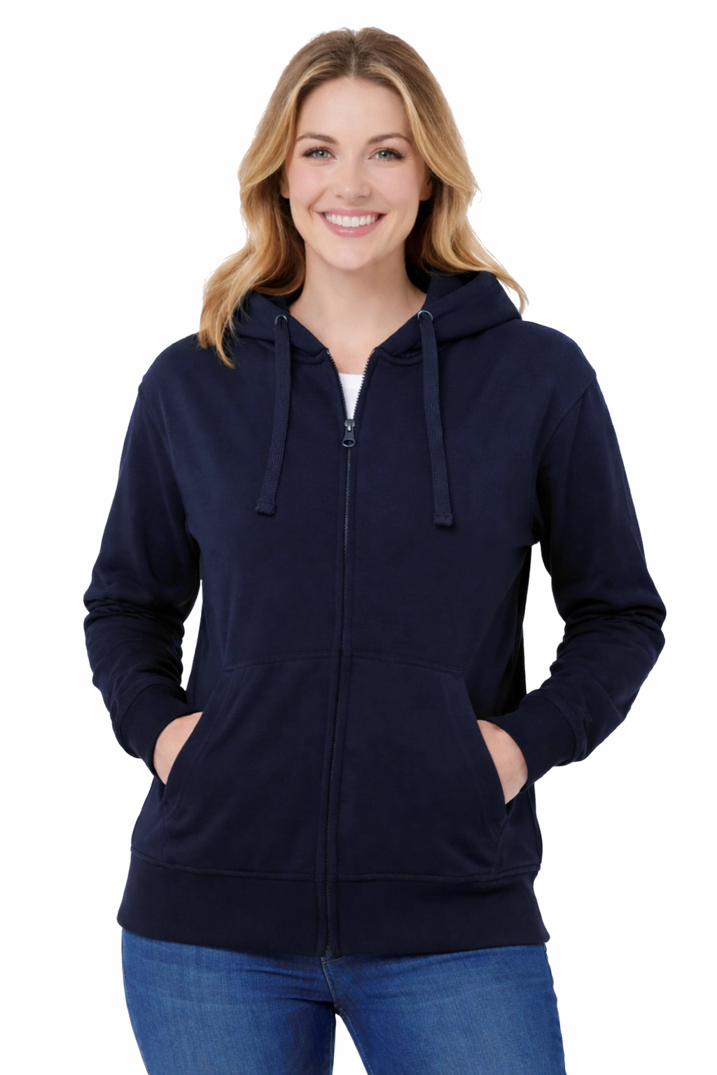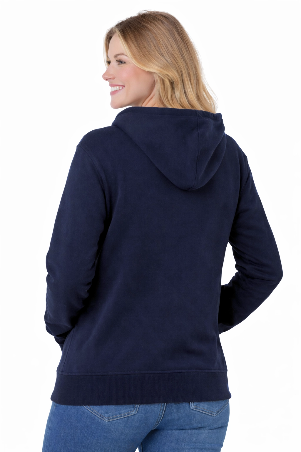Bluză de damă cu glugă, închisă cu fermoar, de culoare bleumarin.