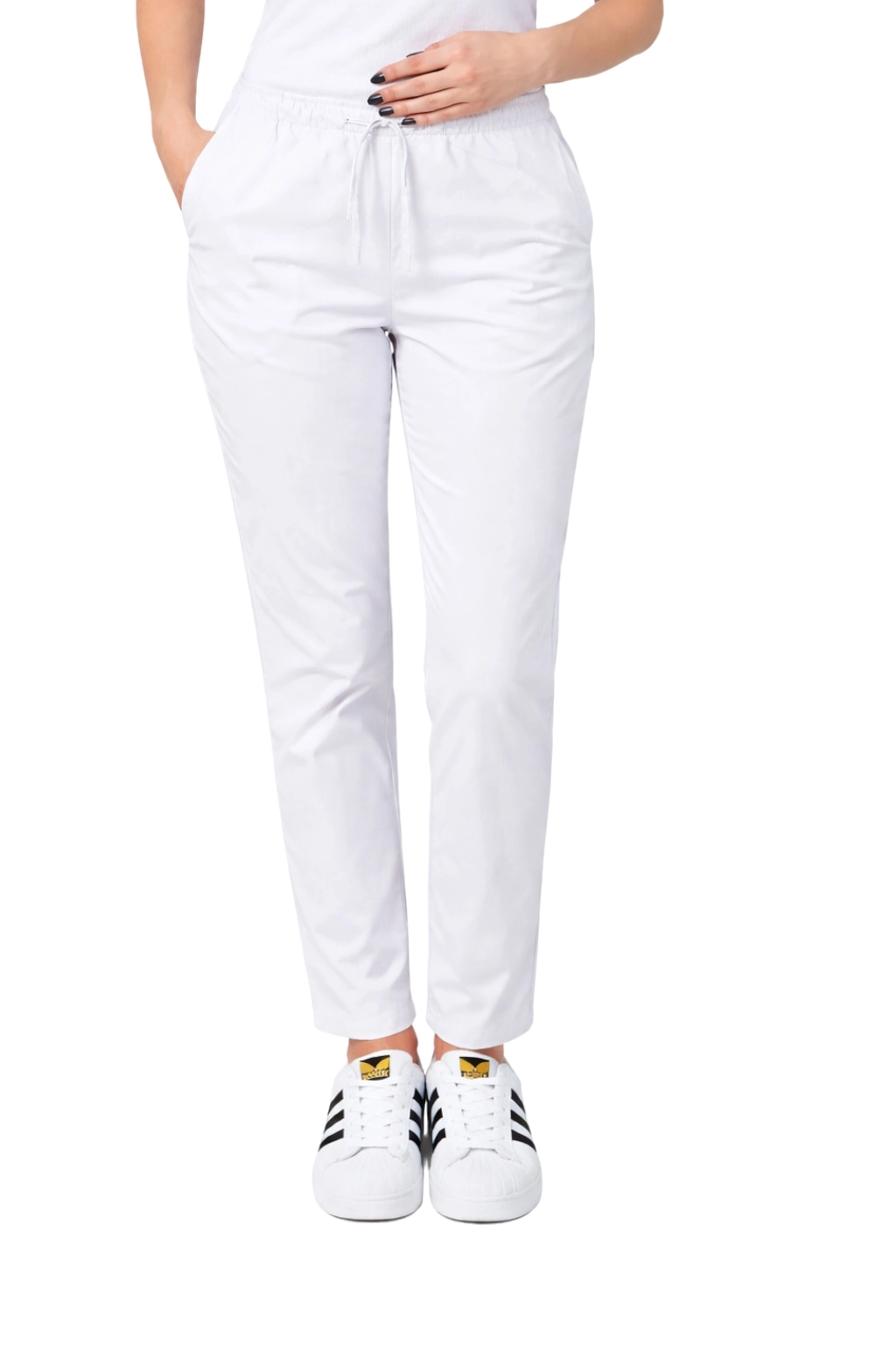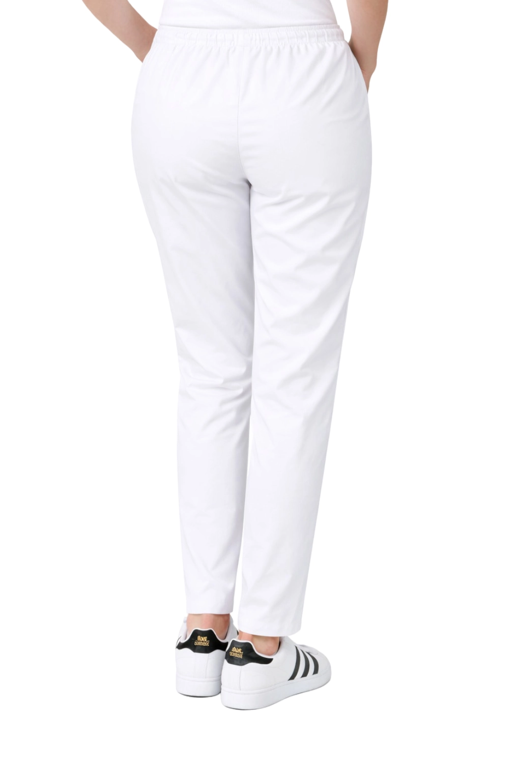 Modelul se distinge prin picioare ușor conice și un cordon elastic în talie, care oferă o potrivire ideală și libertate de mișcare. Două buzunare laterale practice permit păstrarea accesoriilor esențiale, de la stilouri, la echipamente medicale mici. Culoarea albă versatilă face ca pantalonii să se potrivească perfect cu bluzele medicale colorate, permițând crearea de seturi uniforme și moderne.