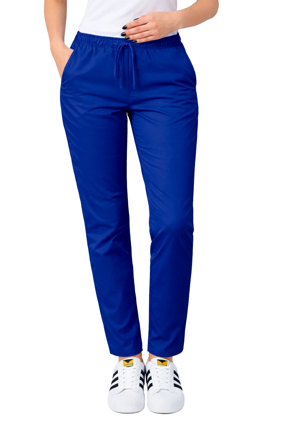 Modelul se remarcă prin uşor conice pe picioare și un cureaua elastică cu șiret, care asigură o potrivire perfectă și libertate de mișcare. Două buzunare laterale practice permit stocarea accesoriilor esențiale, de la pixuri, la echipamente medicale mici. Culoarea albastră universală face ca pantalonii să se potrivească perfect cu bluzele medicale colorate, permițându-vă să creați seturi coerente și moderne.