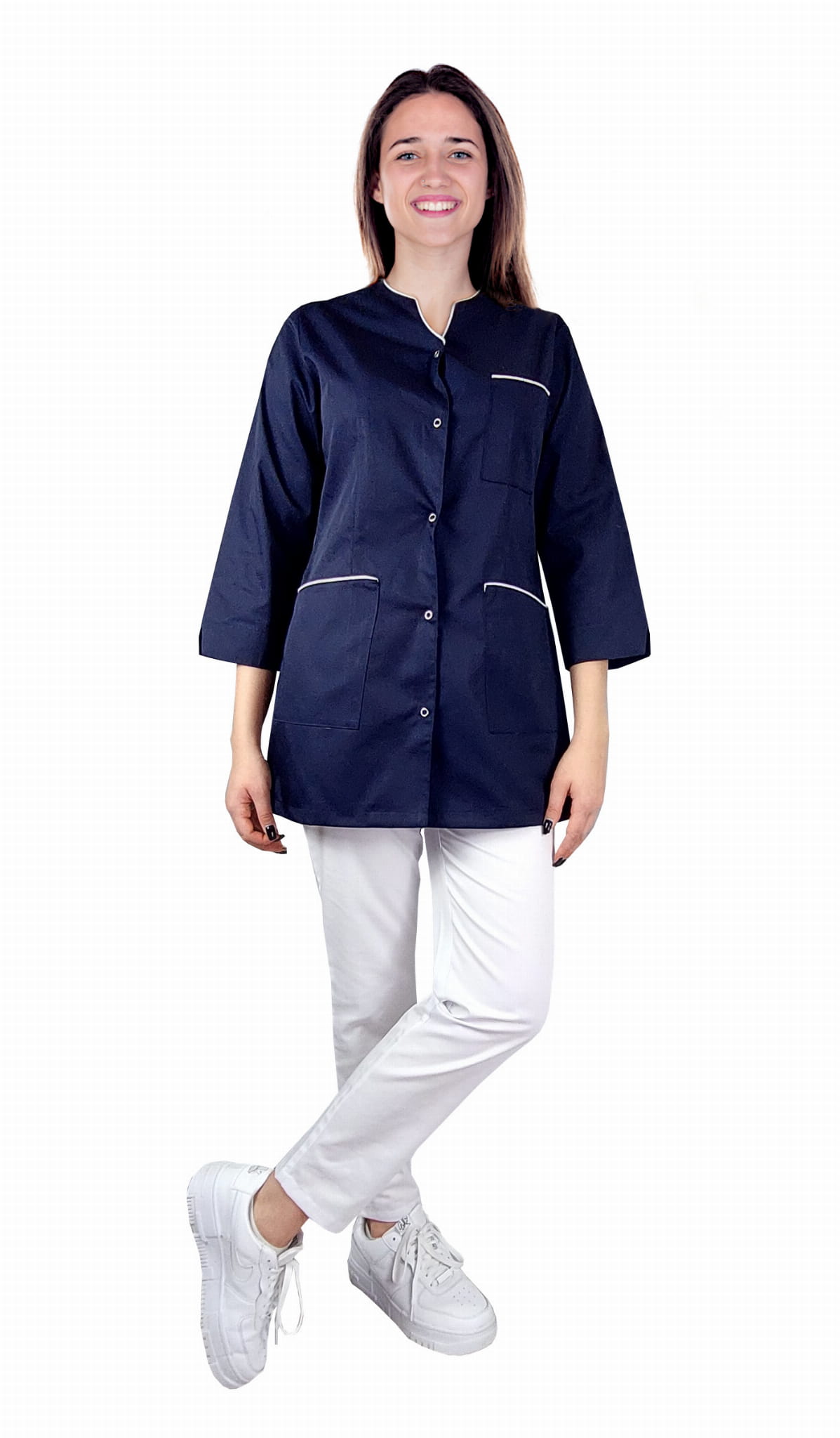 Set medical feminin în nuanțe de albastru marin și alb - jachetă 3/4 armă și pantaloni PHARMACY COMFORT, este o alegere excelentă pentru profesionalele din domeniul medicinei și cosmeticii. Echipamentul nostru unic combină eleganța cu funcționalitatea, asigurând confortul în timpul muncii de zi cu zi. Jacheta cu închidere frontală, cu o acoperire estetică, se potrivește perfect cu pantalonii confortabili model cigarette, care accentuează silueta. Creat cu gândul la farmacii, farmaciști, opticieni și personalul registrelor, uniforma noastră se va dovedi utilă și pentru asistente medicale, cosmeticiene și coafeze. Alegeți un costum confortabil și elegant care vă va ușura provocările de zi cu zi!