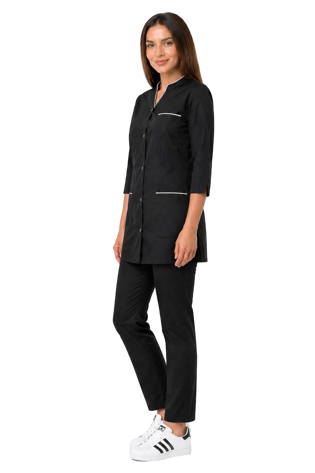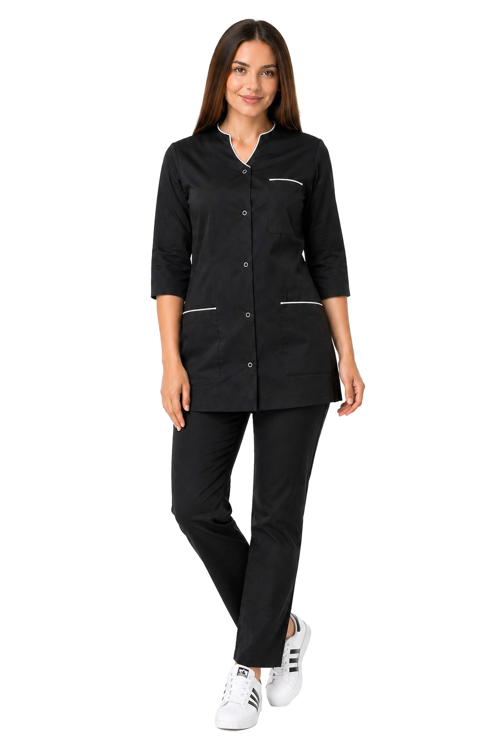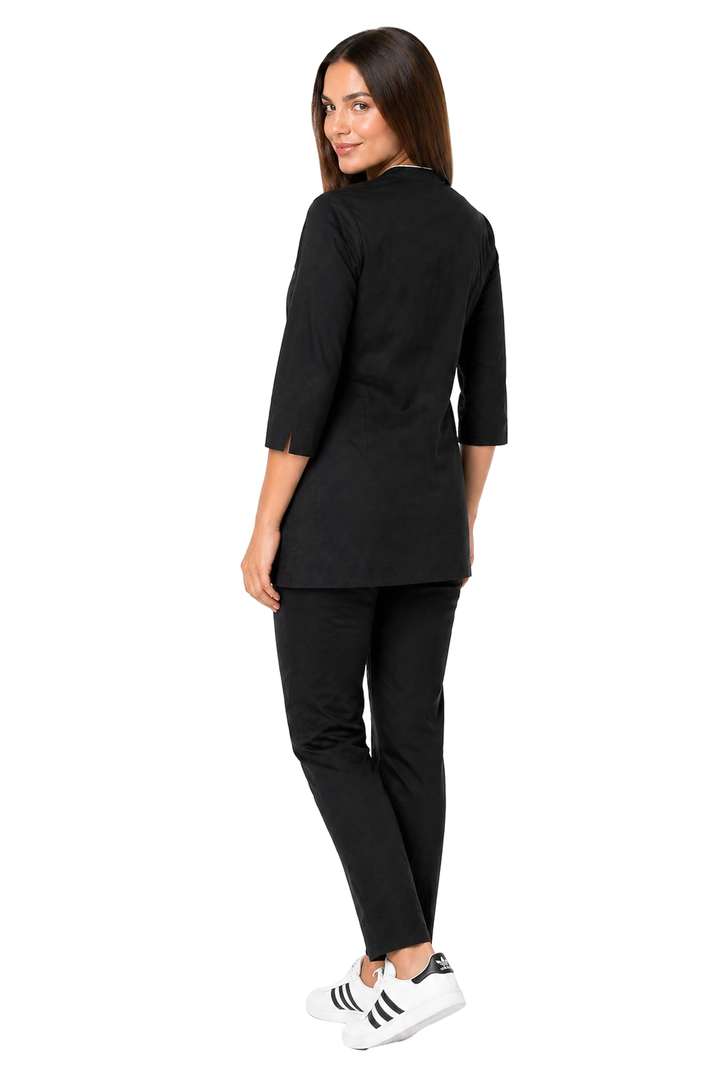 Set medical de damă negru - sacou cu mâneci 3/4 și pantaloni PHARMACY COMFORT este alegerea perfectă pentru profesioniștii din domeniul medicinei și cosmeticii. Setul nostru unic combină eleganța cu funcționalitatea, asigurând confortul în timpul muncii de zi cu zi. Sacoul se închide în față, cu o garnitură estetică, se potrivește perfect cu pantalonii confortabili tip cigarette, care accentuează silueta. Creat gândindu-se la farmacii, farmaciști, opticieni și personalul de înregistrare, uniforma noastră este potrivită și pentru asistente medicale, cosmeticiene și frizeri. Alege o ținută confortabilă și stilată care să vă faciliteze provocările de zi cu zi!