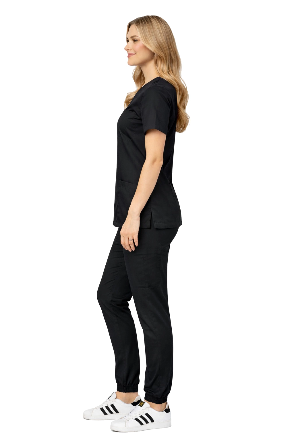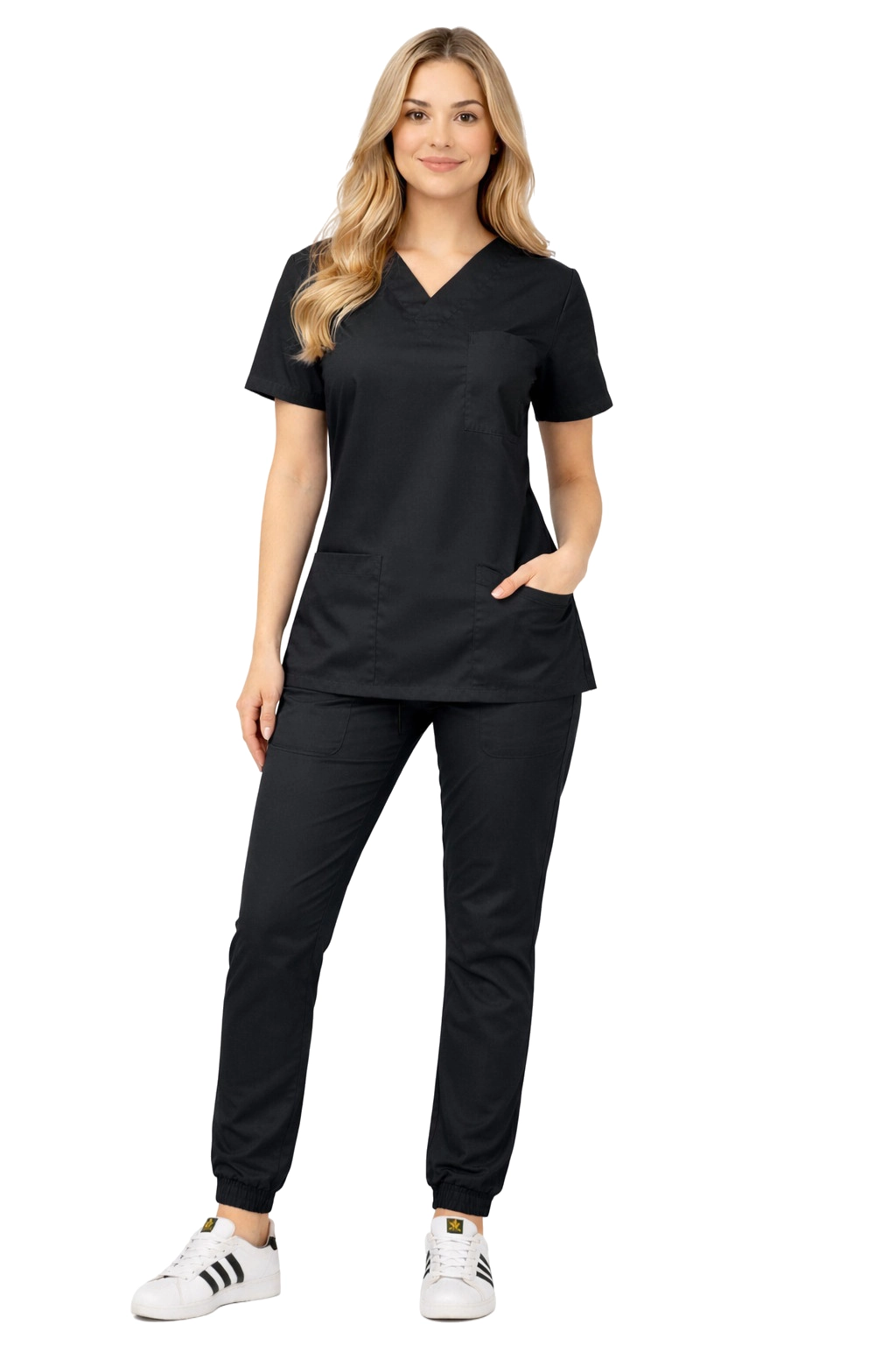 Pantalonii de tip jogger reprezintă o alternativă modernă la pantalonii medicali clasici. Datorită mansetelor elastice la glezne și a taliei pe elastic cu șnur, asigură un confort optim și un aspect sportiv.