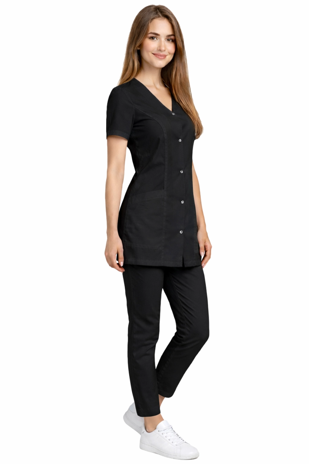 Setul medical feminin CASUAL PREMIUM în culoarea neagră este un uniform elegant, modern și foarte funcțional, conceput pentru femeile care lucrează într-un mediu medical și cosmetic solicitant. Culoarea sobră subliniază profesionalismul, iar croiala atentă asigură confort și libertatea mișcărilor pe tot parcursul zilei.